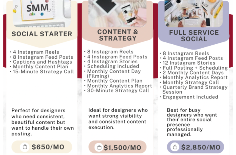 Divine Elements of Design offers curated Social Media Marketing Suites designed exclusively for interior designers, showrooms, and design industry brands. Each suite combines thoughtful strategy, elevated content creation, and industry-specific insight to help your brand stand out online — beautifully and intentionally.